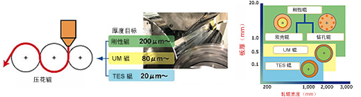 配备刚性及弹性特强的轧辊,包括压花辊,接触辊刻有不同的细沟,适用于板材成形。(厚度范围 20μm-20mm)根据选择的细沟类型更改成形方案,可制造各种各样的产品。